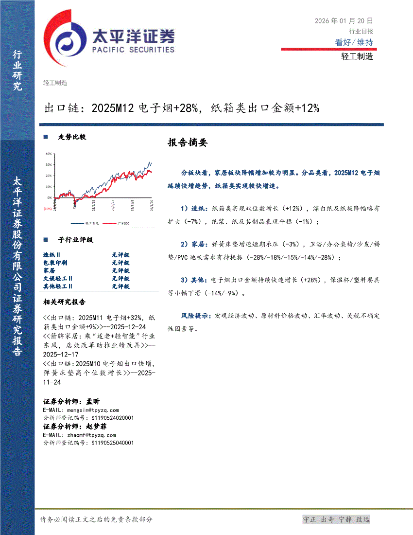 轻工制造行业:太平洋证券-轻工制造行业日报:出口链,2025M12电子烟+28%,纸箱类出口金额+12%-260120