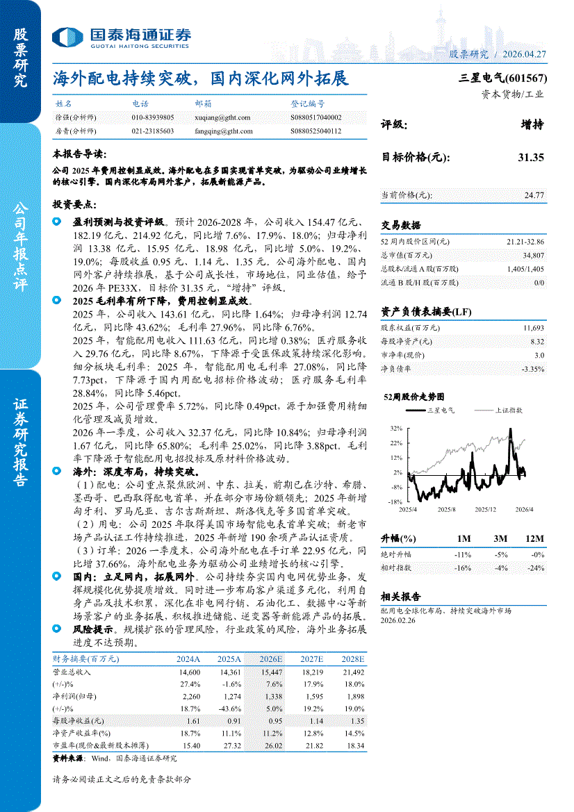 三星电气:国泰海通证券-三星电气-601567-海外配电持续突破,国内深化网外拓展-260427
