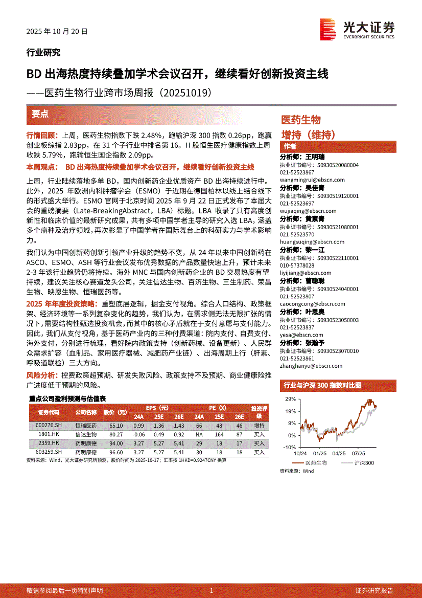 医药生物行业:光大证券-医药生物行业跨市场周报:BD出海热度持续叠加学术会议召开,继续看好创新投资主线-251020
