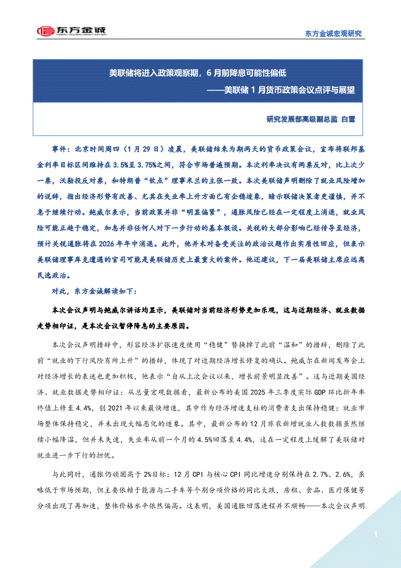 东方金诚-美联储1月货币政策会议点评与展望:美联储将进入政策观察期,6月前降息可能性偏低-260129
