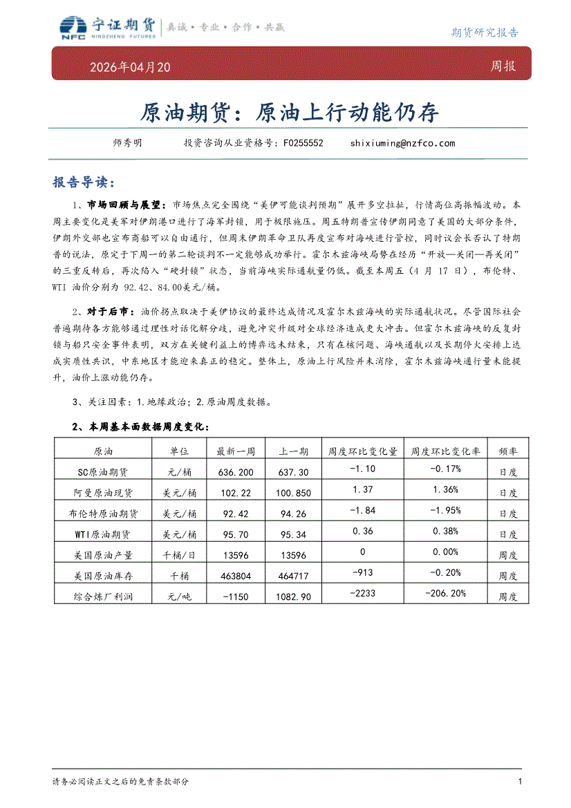 宁证期货-原油期货周报:原油上行动能仍存-260420