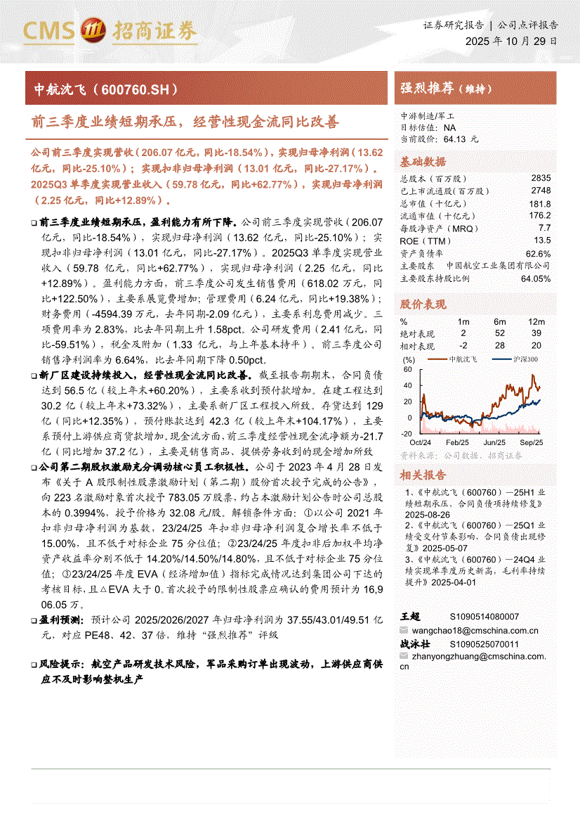 中航沈飞:招商证券-中航沈飞-600760-前三季度业绩短期承压,经营性现金流同比改善-251029