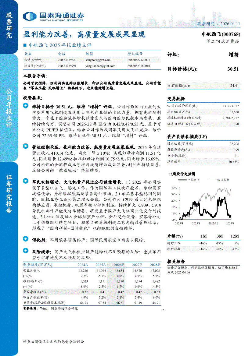 中航西飞:国泰海通证券-中航西飞-000768-2025年报业绩点评:盈利能力改善,高质量发展成果显现-260411