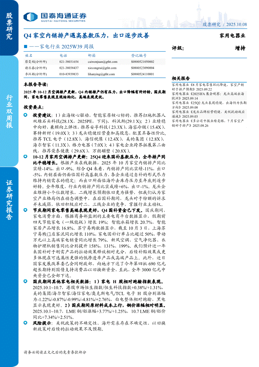 家电行业:国泰海通证券-家电行业2025W39周报:Q4家空内销排产遇高基数压力,出口逐步改善-251008