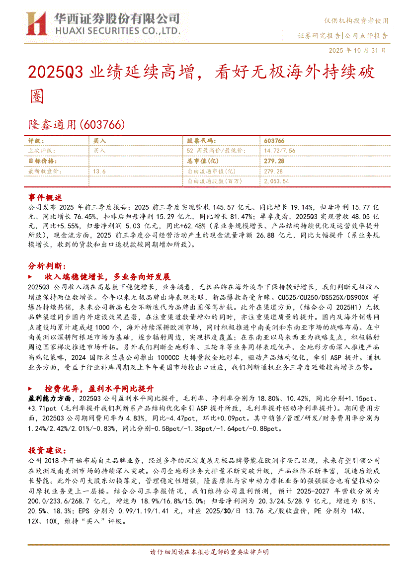 隆鑫通用:华西证券-隆鑫通用-603766-2025Q3业绩延续高增,看好无极海外持续破圈-251031