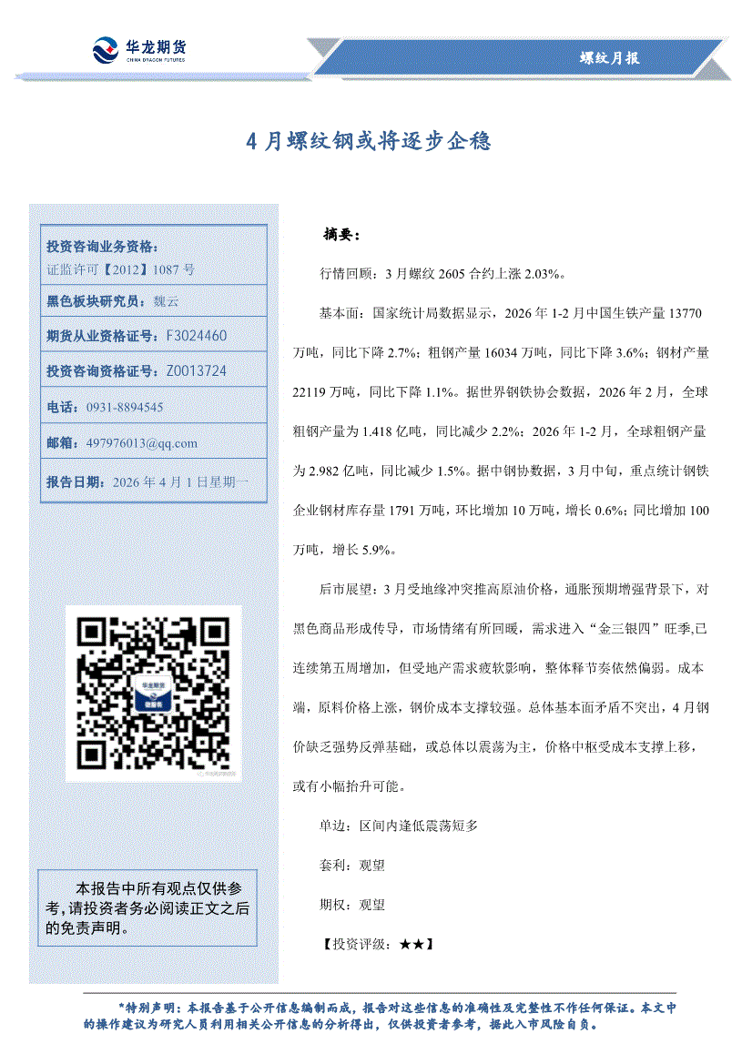 华龙期货-螺纹月报:4月螺纹钢或将逐步企稳-260401