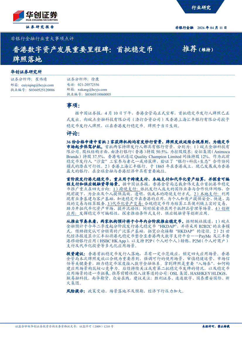 非银行金融行业:华创证券-非银行金融行业重大事项点评:香港数字资产发展重要里程碑,首批稳定币牌照落地-260411