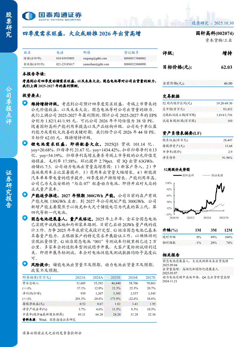 国轩高科:国泰海通证券-国轩高科-002074-四季度需求旺盛,大众或助推2026年出货高增-251030