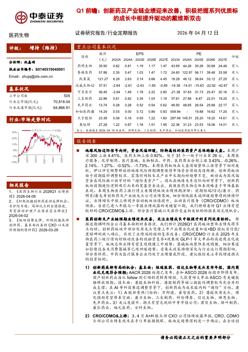 医药生物行业:中泰证券-医药生物行业Q1前瞻:创新药及产业链业绩迎来改善,积极把握系列优质标的成长中枢提升驱动的戴维斯双击-260412