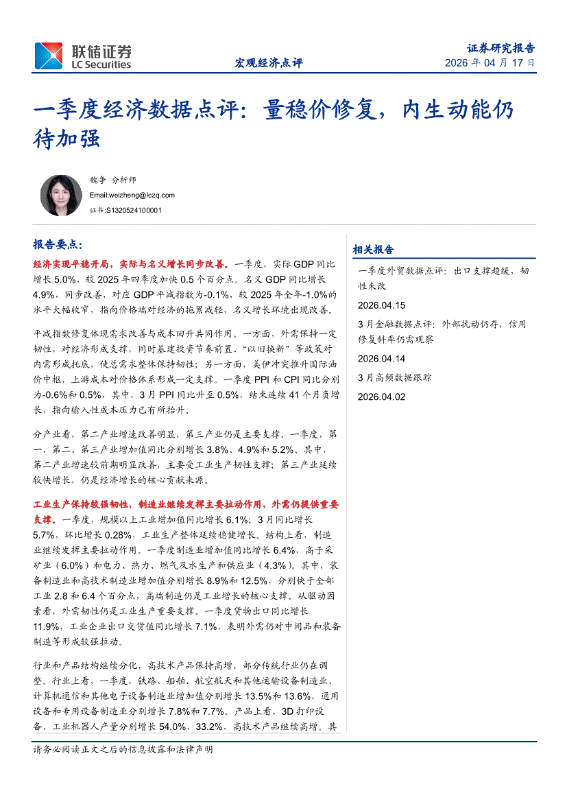 联储证券-一季度经济数据点评:量稳价修复,内生动能仍待加强-260417