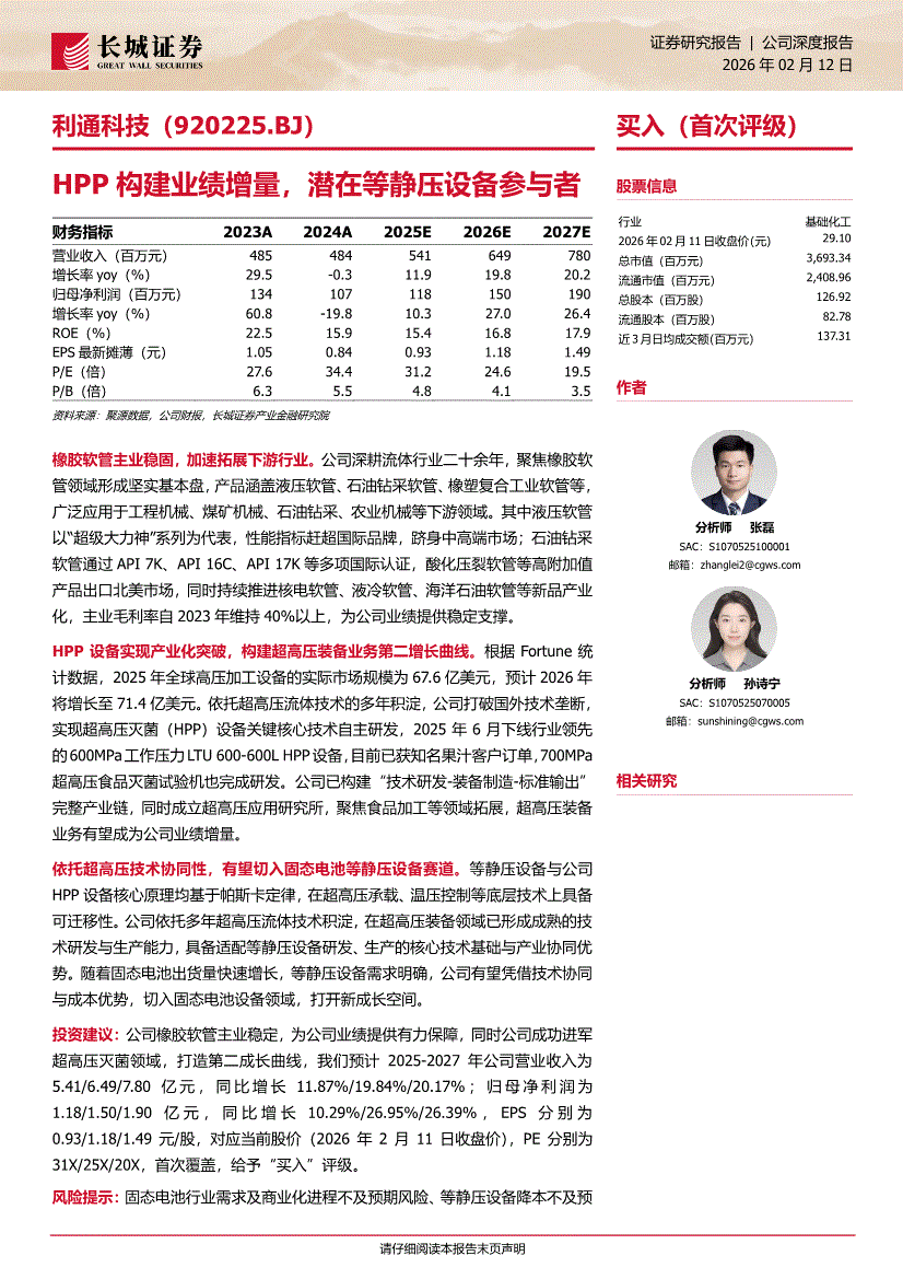 利通科技:长城证券-利通科技-920225-HPP构建业绩增量,潜在等静压设备参与者-260212