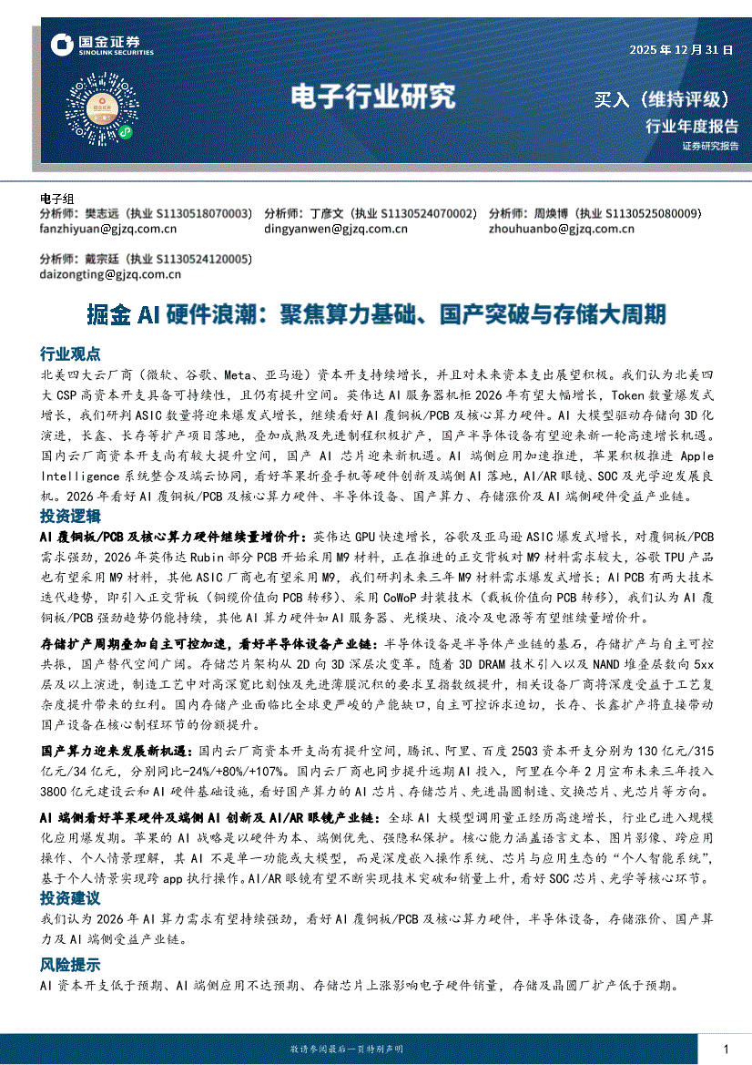 电子行业:国金证券-电子行业年度报告:掘金AI硬件浪潮,聚焦算力基础、国产突破与存储大周期-251231