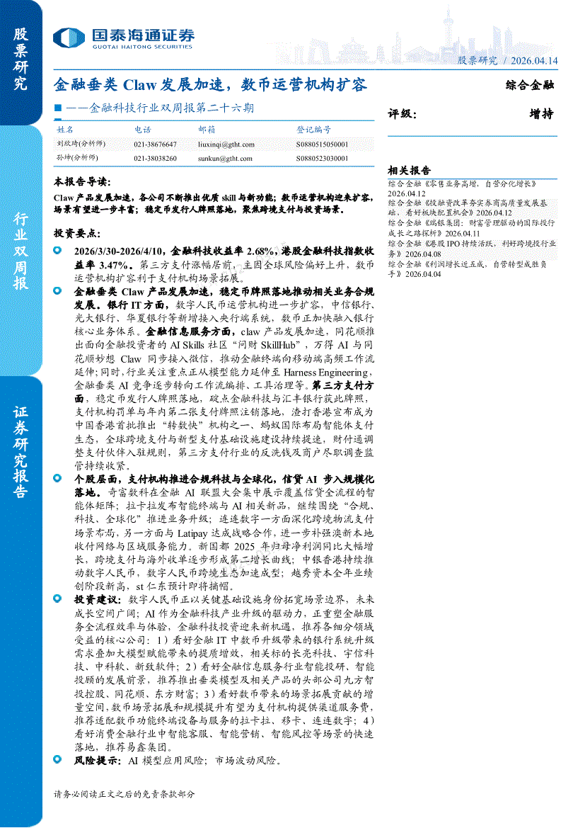 金融科技行业:国泰海通证券-金融科技行业双周报第二十六期:金融垂类Claw发展加速,数币运营机构扩容-260414