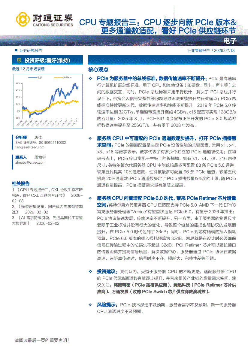 电子行业:财通证券-电子行业CPU专题报告三:CPU逐步向新PCIe版本&更多通道数适配,看好PCIe供应链环节-260218