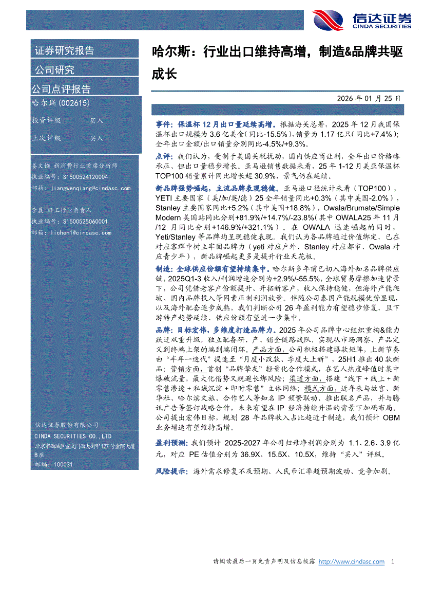 哈尔斯:信达证券-哈尔斯-002615-行业出口维持高增,制造&品牌共驱成长-260125