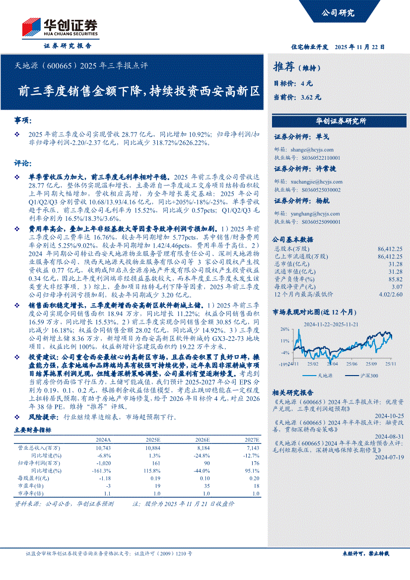天地源:华创证券-天地源-600665-2025年三季报点评:前三季度销售金额下降,持续投资西安高新区-251122