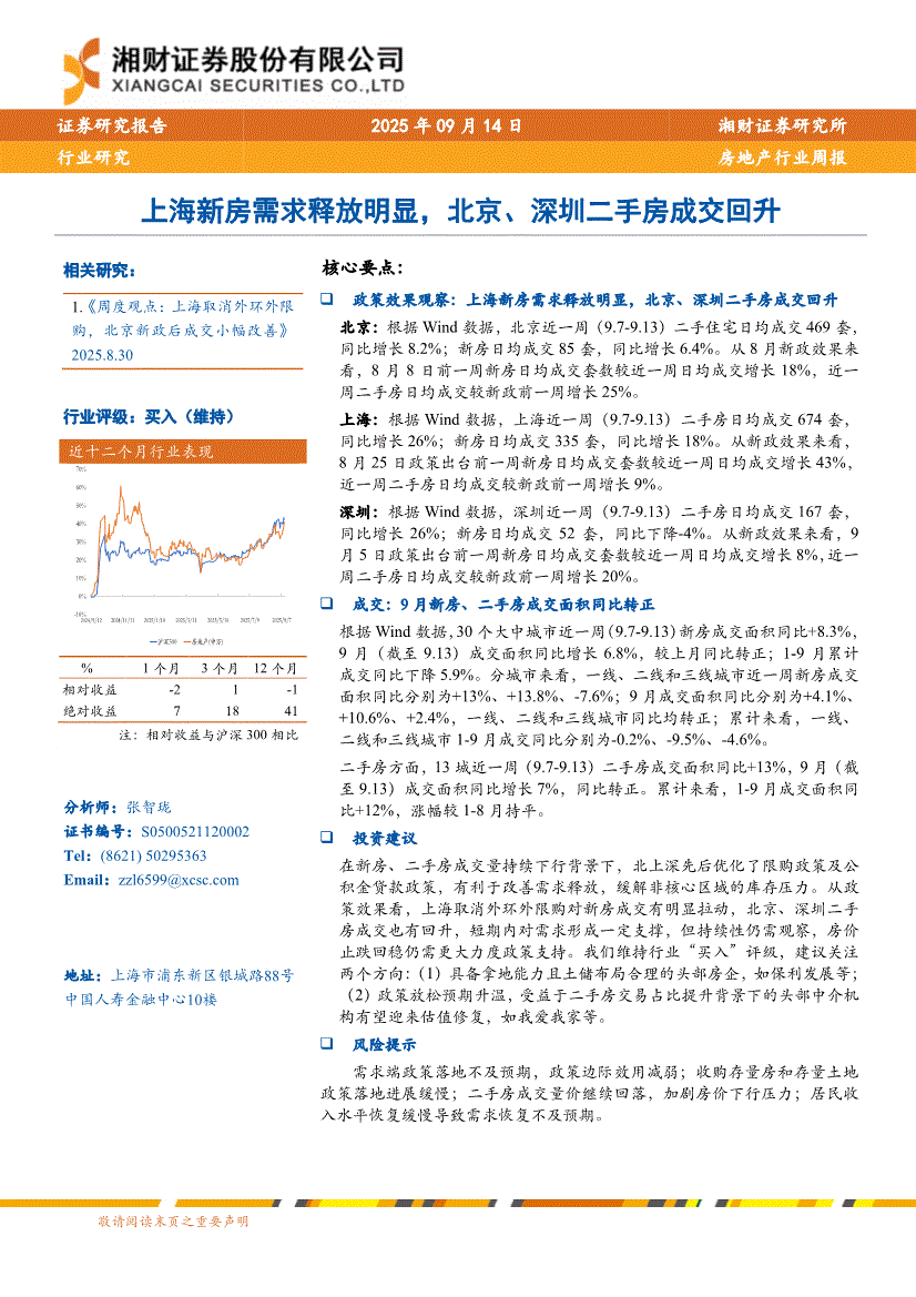 房地产行业:湘财证券-房地产行业周报:上海新房需求释放明显,北京、深圳二手房成交回升-250914