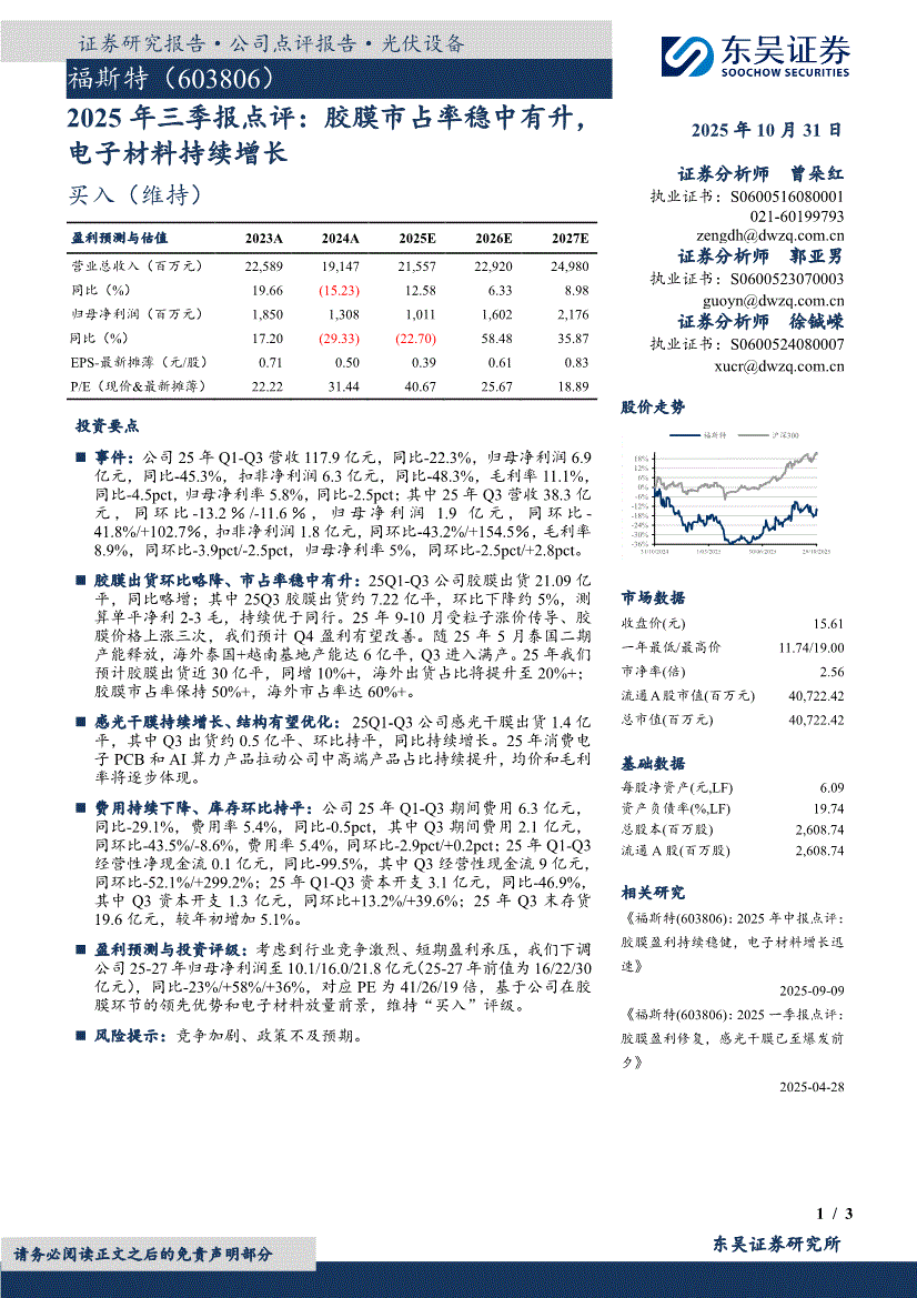 福斯特:东吴证券-福斯特-603806-2025年三季报点评:胶膜市占率稳中有升,电子材料持续增长-251031