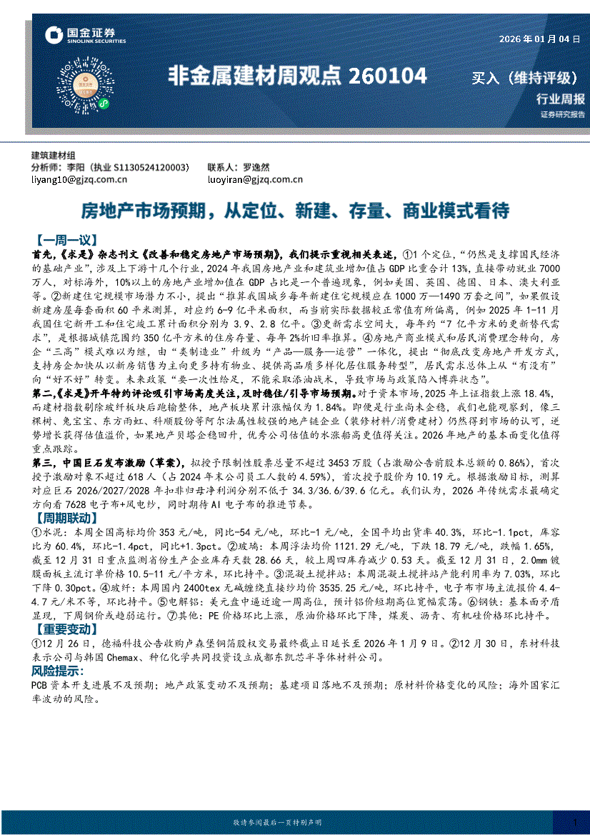 非金属建材行业:国金证券-非金属建材行业周观点:房地产市场预期,从定位、新建、存量、商业模式看待-260104