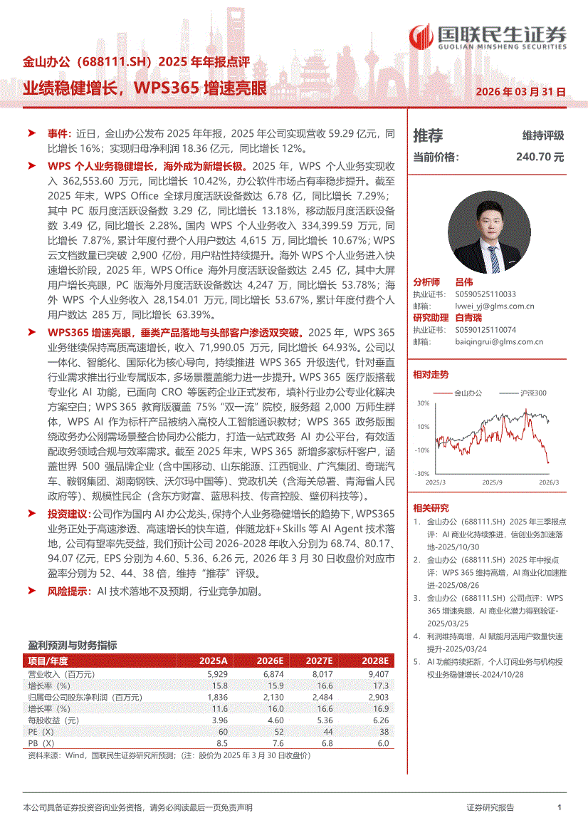 金山办公:国联民生证券-金山办公-688111-2025年年报点评:业绩稳健增长,WPS365增速亮眼-260331