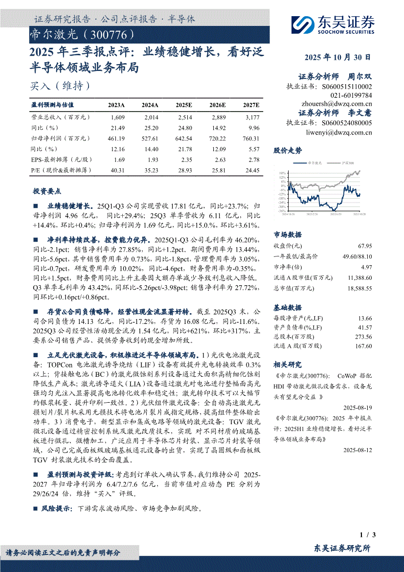 帝尔激光:东吴证券-帝尔激光-300776-2025年三季报点评:业绩稳健增长,看好泛半导体领域业务布局-251030
