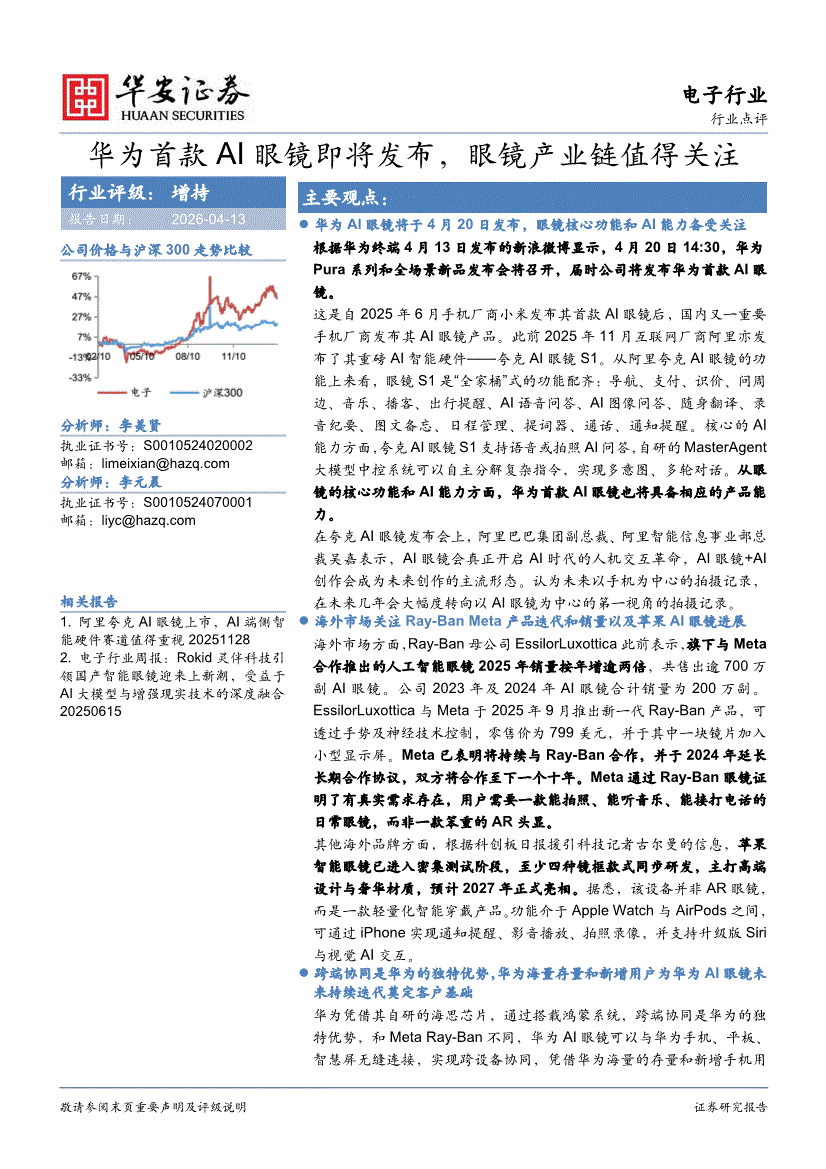 电子行业:华安证券-电子行业点评:华为首款AI眼镜即将发布,眼镜产业链值得关注-260413