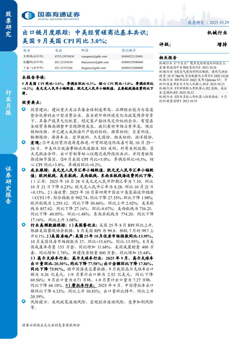 机械行业:国泰海通证券-机械行业出口链月度跟踪:中美经贸磋商达基本共识;美国9月美国CPI同比3.0%;-251029