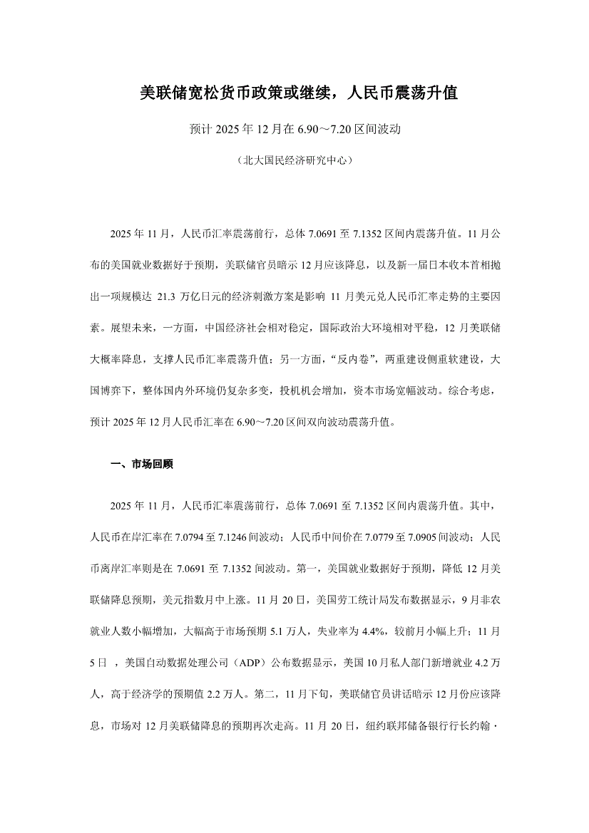北大国民经济研究中心-美联储宽松货币政策或继续,人民币震荡升值,预计2025年12月在6.90~7.20区间波动-251205