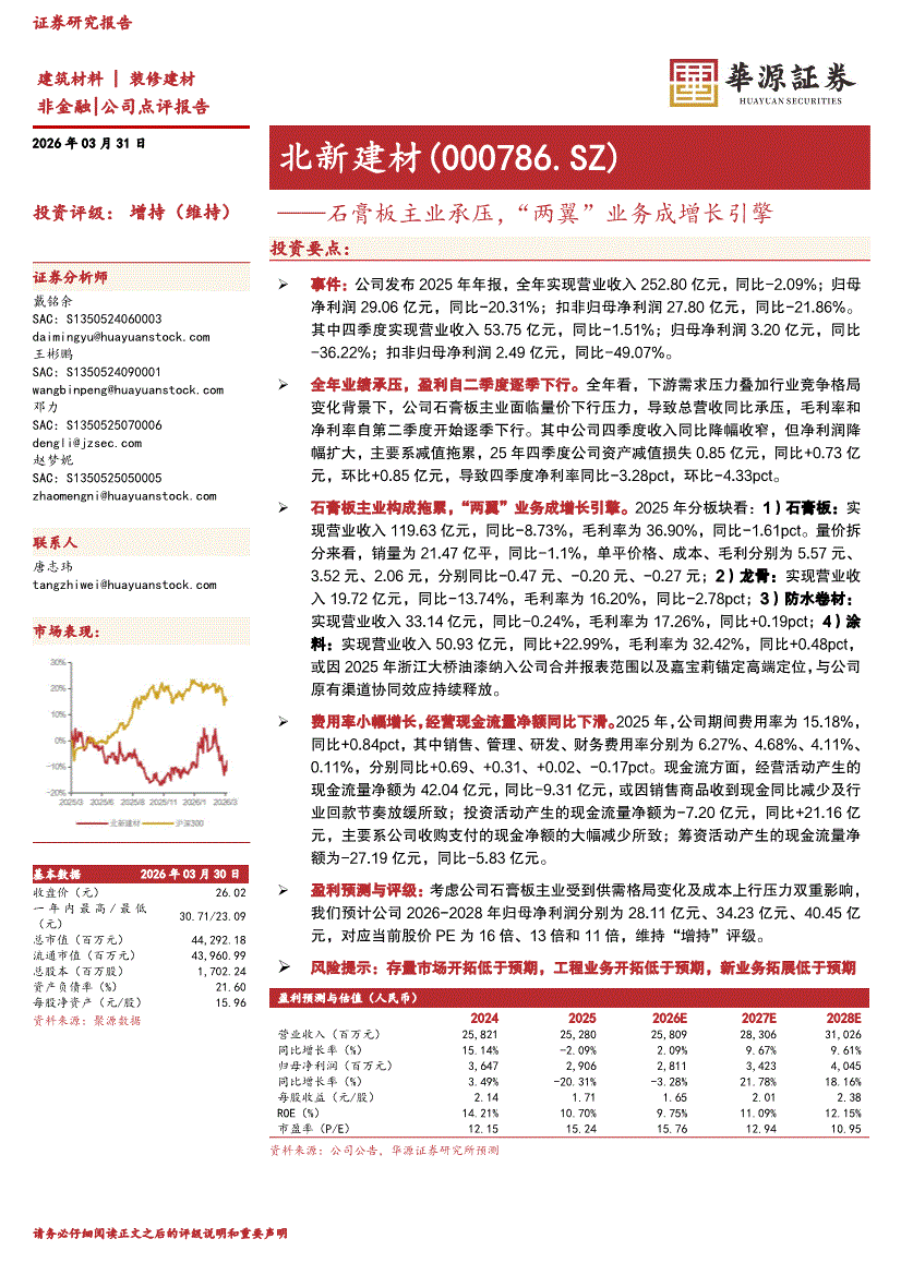 北新建材:华源证券-北新建材-000786-石膏板主业承压,“两翼”业务成增长引擎-260331