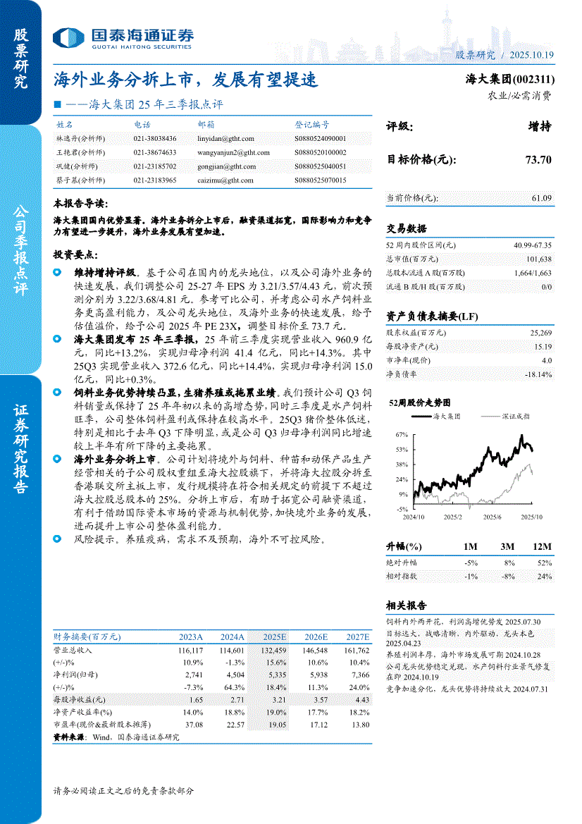 海大集团:国泰海通证券-海大集团-002311-25年三季报点评:海外业务分拆上市,发展有望提速-251019