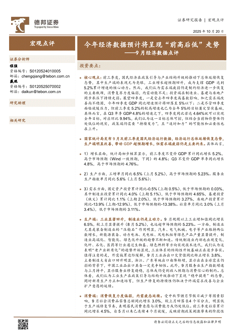 德邦证券-9月经济数据点评:今年经济数据预计将呈现“前高后低”走势-251020