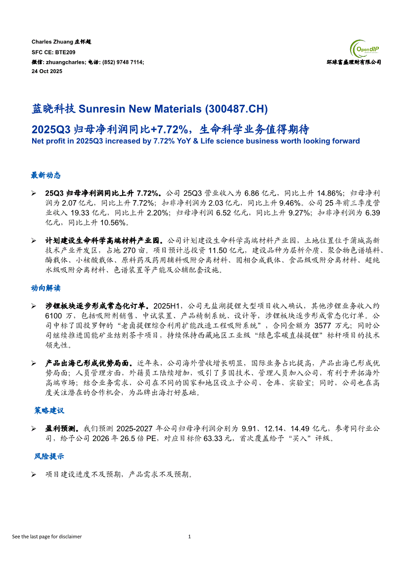 环球富盛-蓝晓科技-300487-2025Q3归母净利润同比+7.72%,生命科学业务值得期待-251024