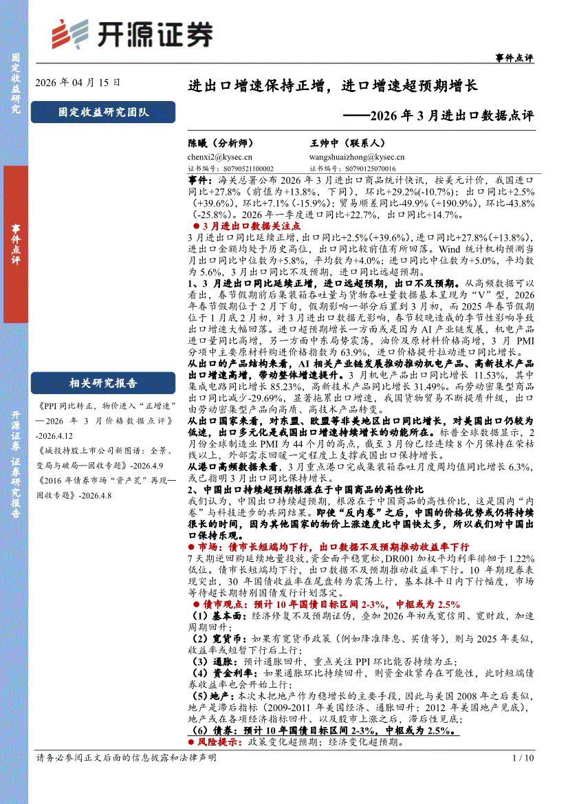 开源证券-2026年3月进出口数据点评:进出口增速保持正增,进口增速超预期增长-260415