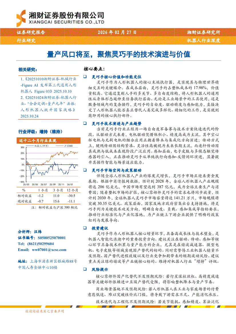 机器人行业:湘财证券-机器人行业深度:量产风口将至,聚焦灵巧手的技术演进与价值-260227