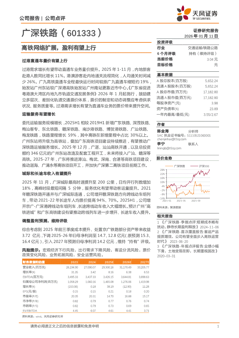 广深铁路:天风证券-广深铁路-601333-高铁网络扩展,盈利有望上行-260111
