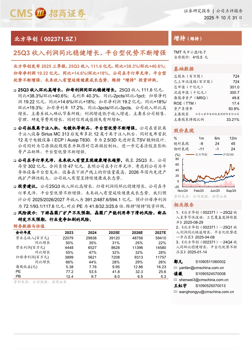 北方华创:招商证券-北方华创-002371-25Q3收入利润同比稳健增长,平台型优势不断增强-251031