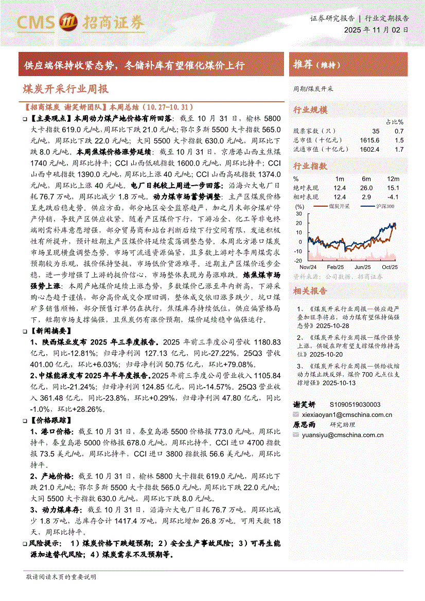 煤炭开采行业:招商证券-煤炭开采行业周报:供应端保持收紧态势,冬储补库有望催化煤价上行-251102