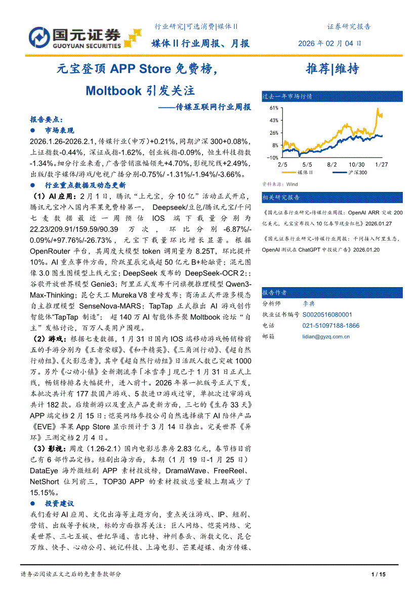 传媒互联网行业:国元证券-传媒互联网行业周报:元宝登顶APPStore免费榜,Moltbook引发关注-260204