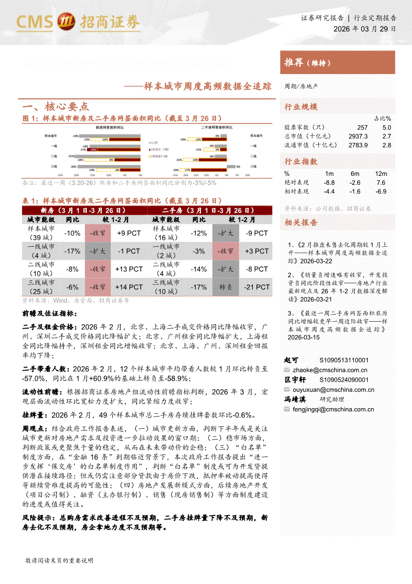 房地产行业:招商证券-房地产行业样本城市周度高频数据全追踪:最近一周新房和二手房网签面积均低于去年同期-260329