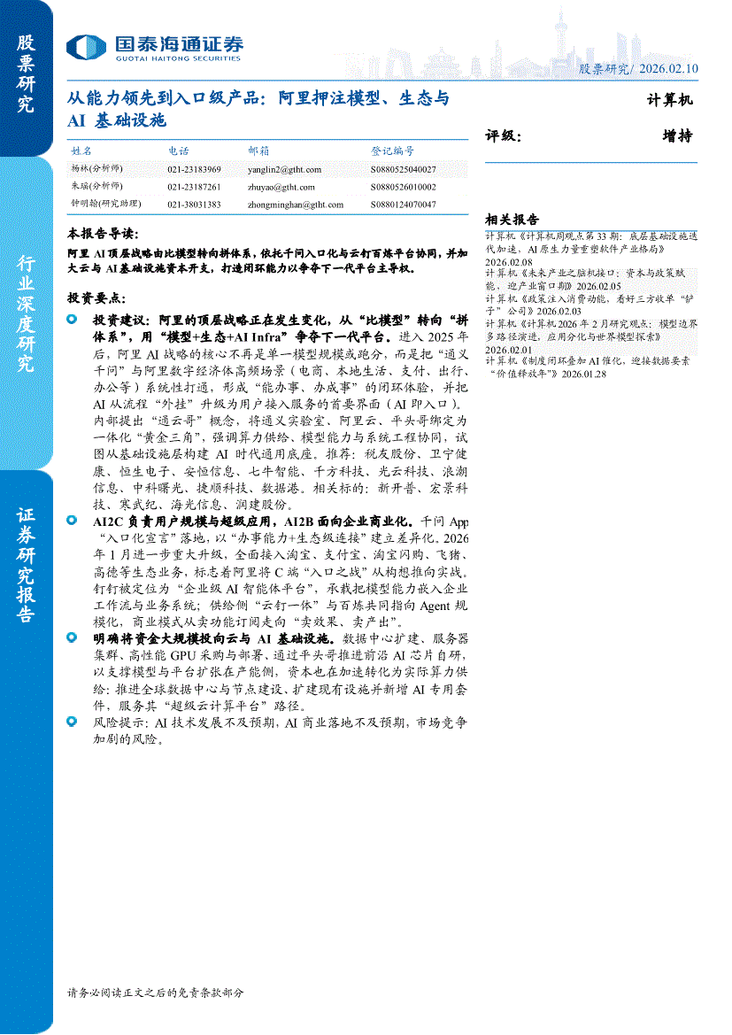 计算机行业:国泰海通证券-计算机行业:从能力领先到入口级产品,阿里押注模型、生态与AI基础设施-260210