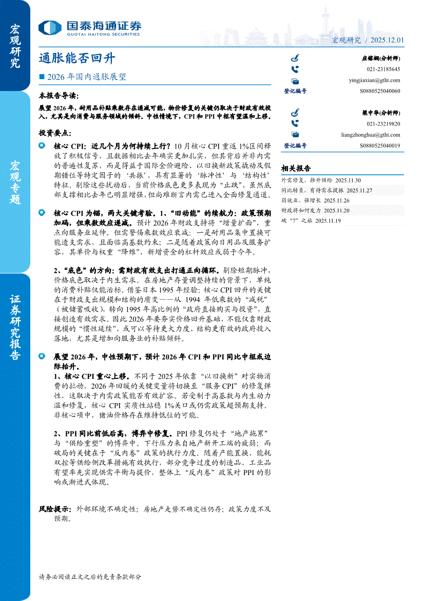 国泰海通证券-2026年国内通胀展望:通胀能否回升-251201