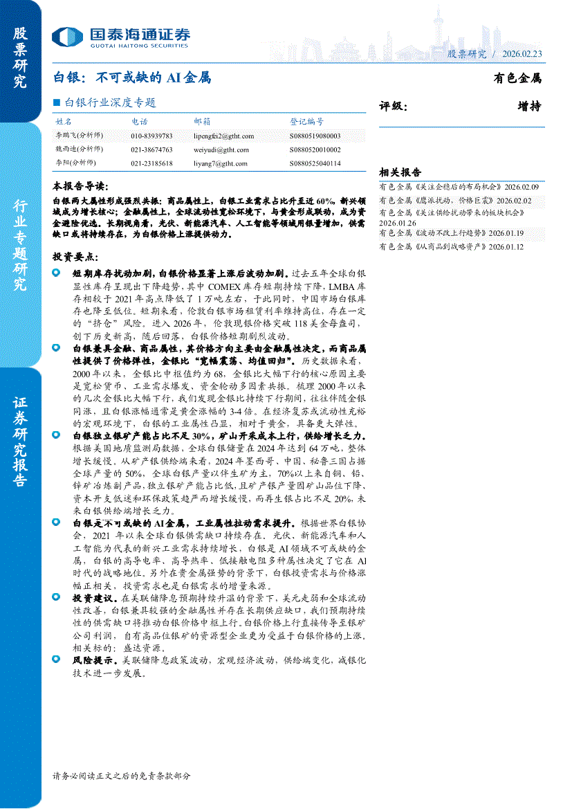 有色金属行业:国泰海通证券-白银行业深度专题:白银,不可或缺的AI金属-260223
