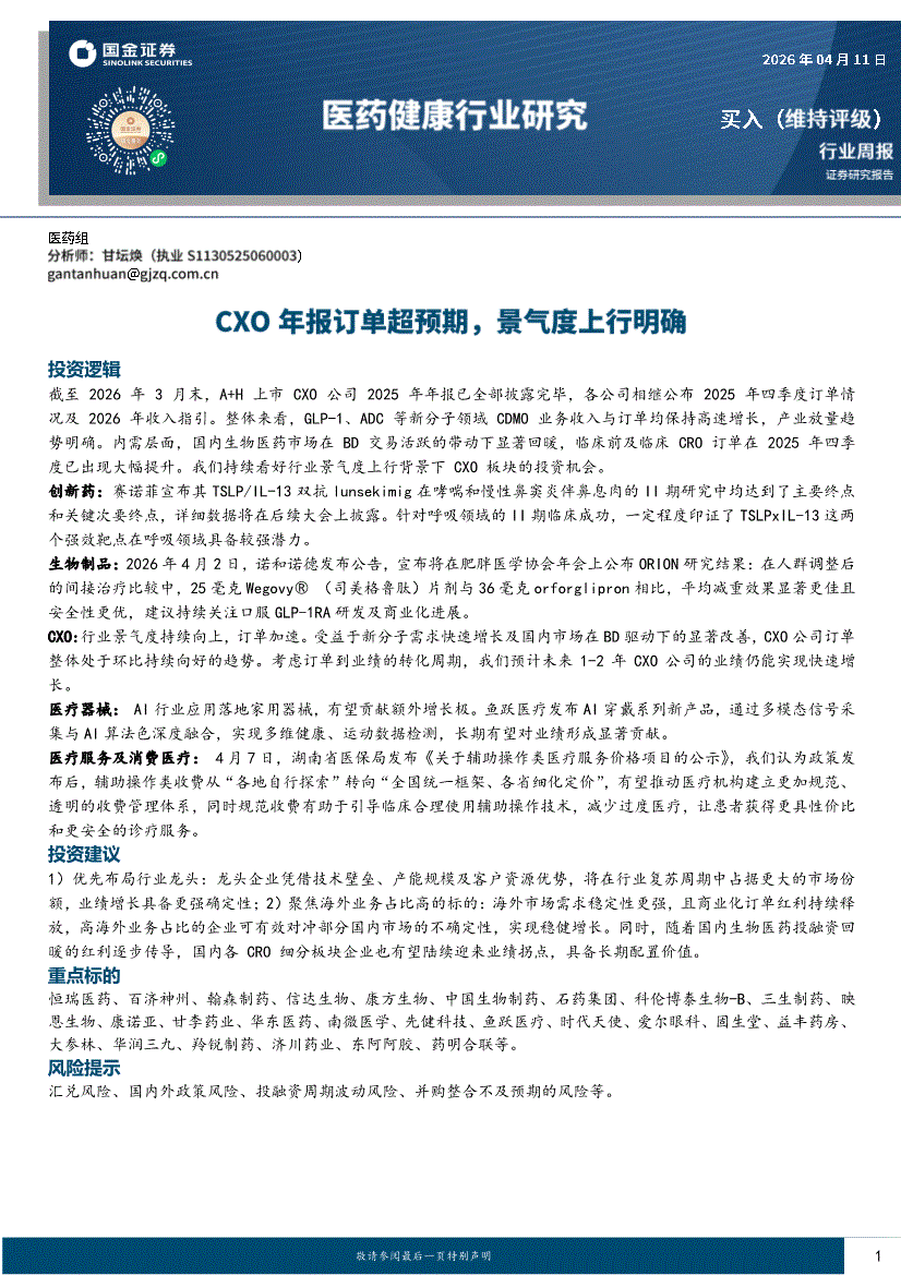 医药健康行业:国金证券-医药健康行业周报:CXO年报订单超预期,景气度上行明确-260411