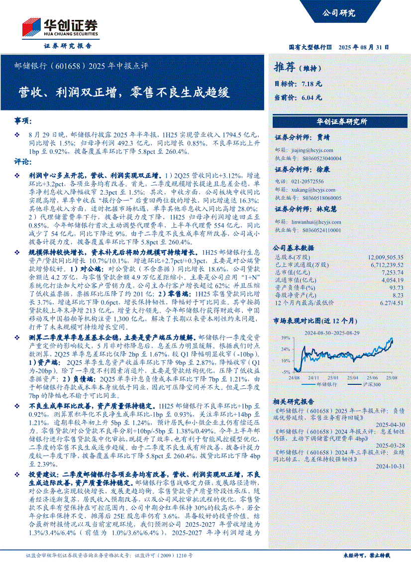 邮储银行:华创证券-邮储银行-601658-2025年中报点评:营收、利润双正增,零售不良生成趋缓-250831