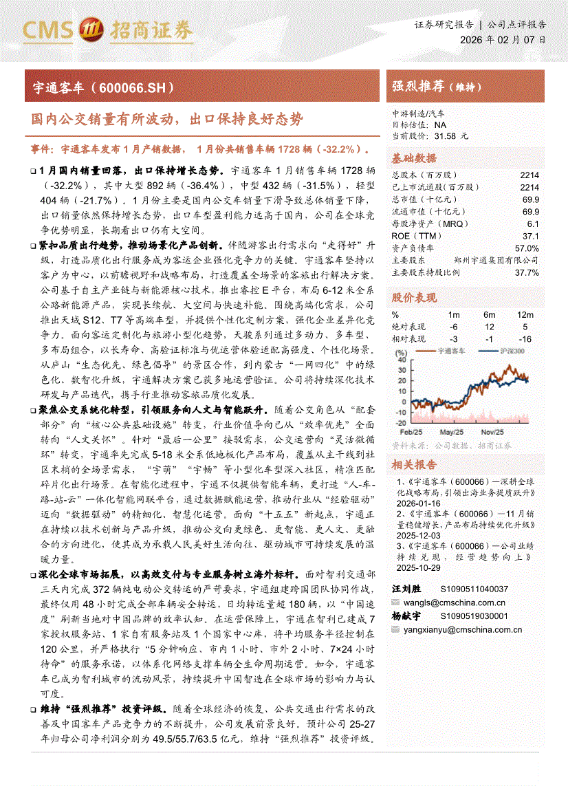 宇通客车:招商证券-宇通客车-600066-国内公交销量有所波动,出口保持良好态势-260207
