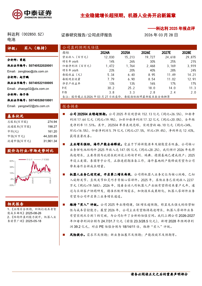 科达利:中泰证券-科达利-002850-2025年报点评:主业稳健增长超预期,机器人业务开启新篇章-260328