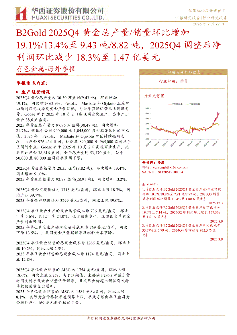 有色金属行业:华西证券-有色金属行业~海外季报:B2Gold 2025Q4黄金总产量/销量环比增加19.1%/13.4%至9.43吨/8.82吨,2025Q4调整后净利润环比减少18.3%至1.47亿美元-260227