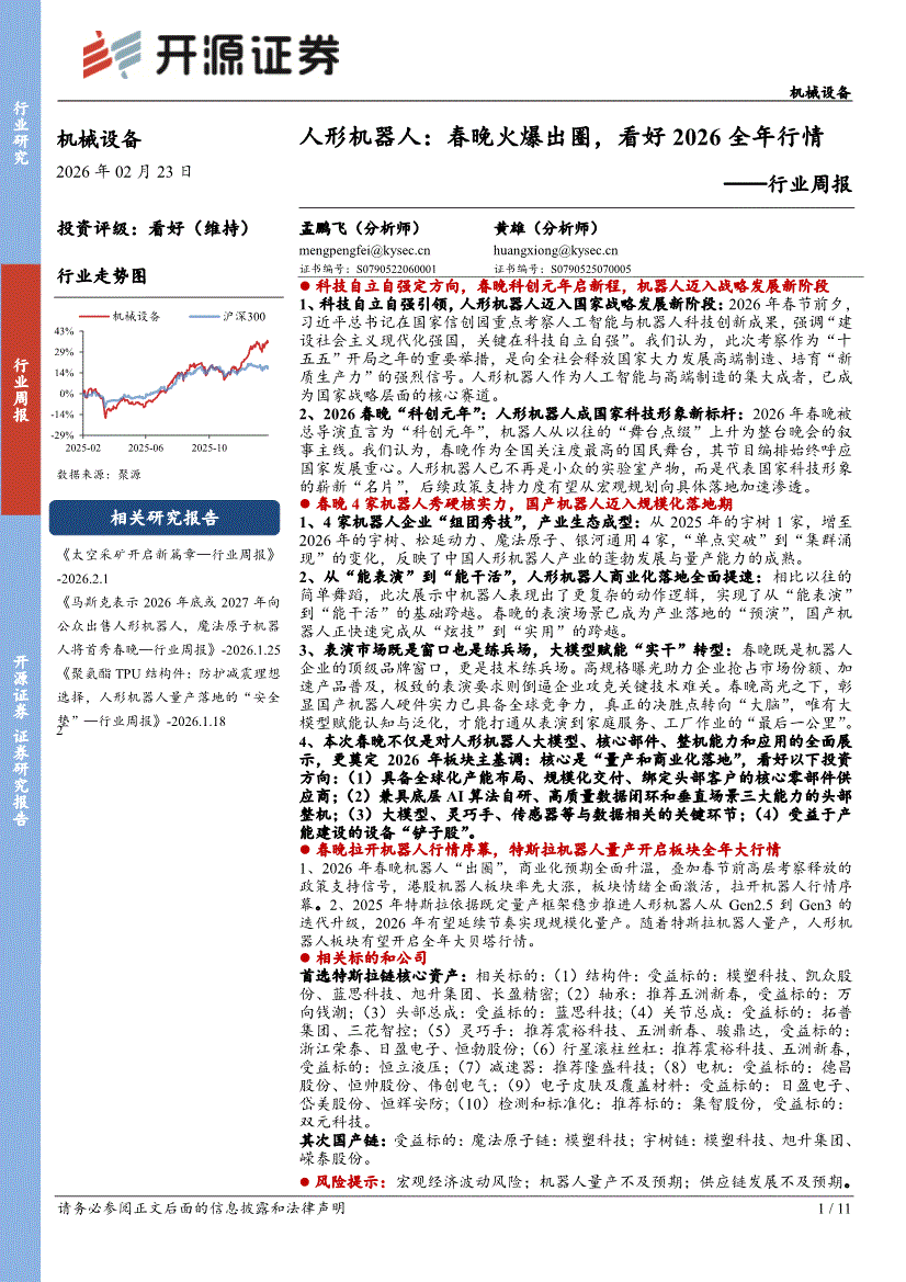 机械设备行业:开源证券-机械设备行业周报:人形机器人,春晚火爆出圈,看好2026全年行情-260223