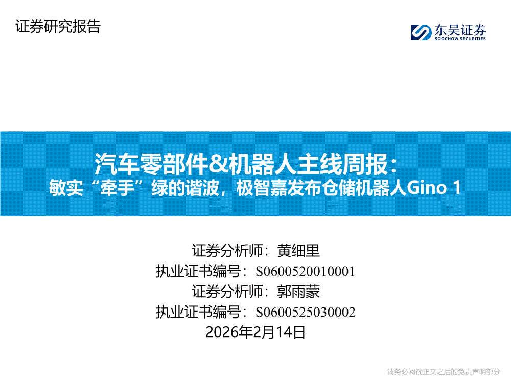 汽车零部件&机器人行业:东吴证券-汽车零部件&机器人行业主线周报:敏实“牵手”绿的谐波,极智嘉发布仓储机器人Gino 1-260214