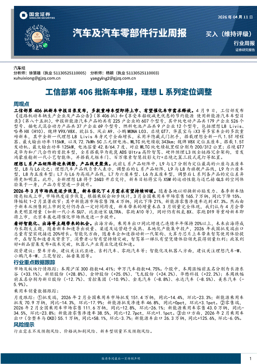 汽车及汽车零部件行业:国金证券-汽车及汽车零部件行业周报:工信部第406批新车申报,理想L系列定位调整-260411